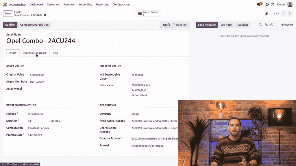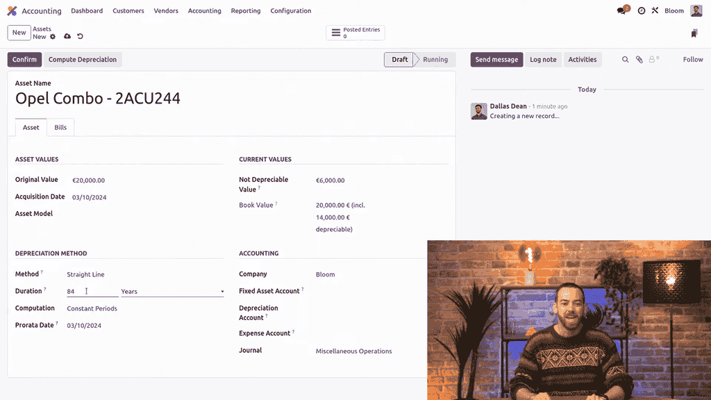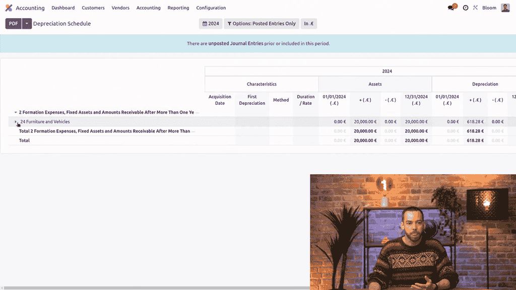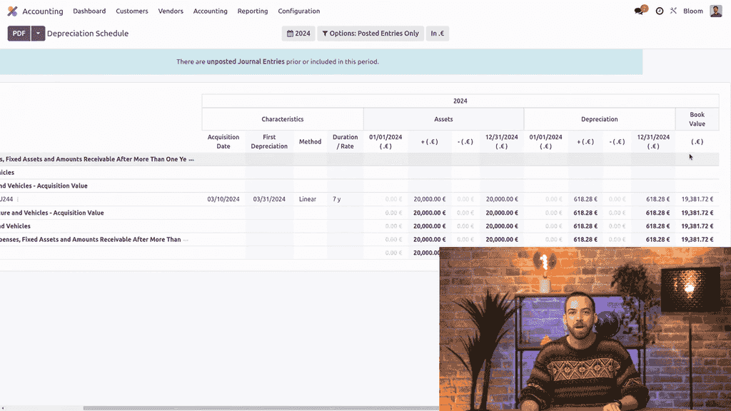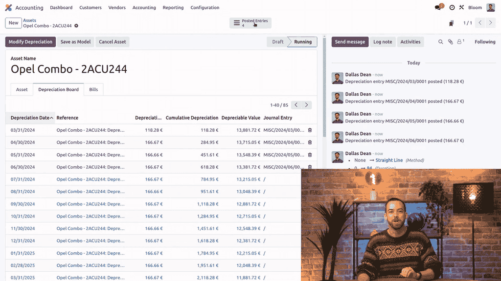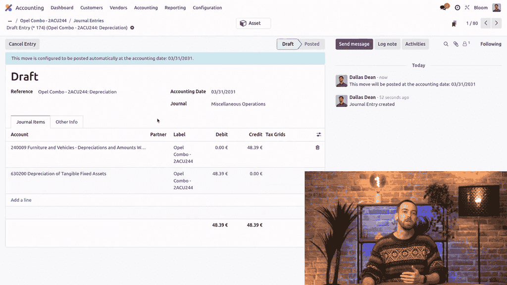 Odoo Accounting automates this process. You define the asset once, and Odoo generates all the depreciation entries for you.