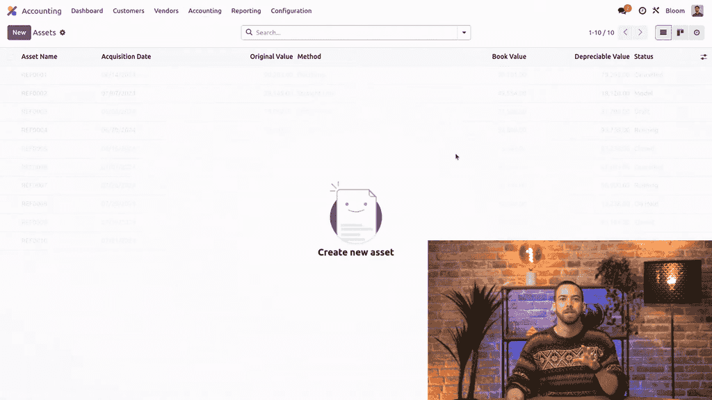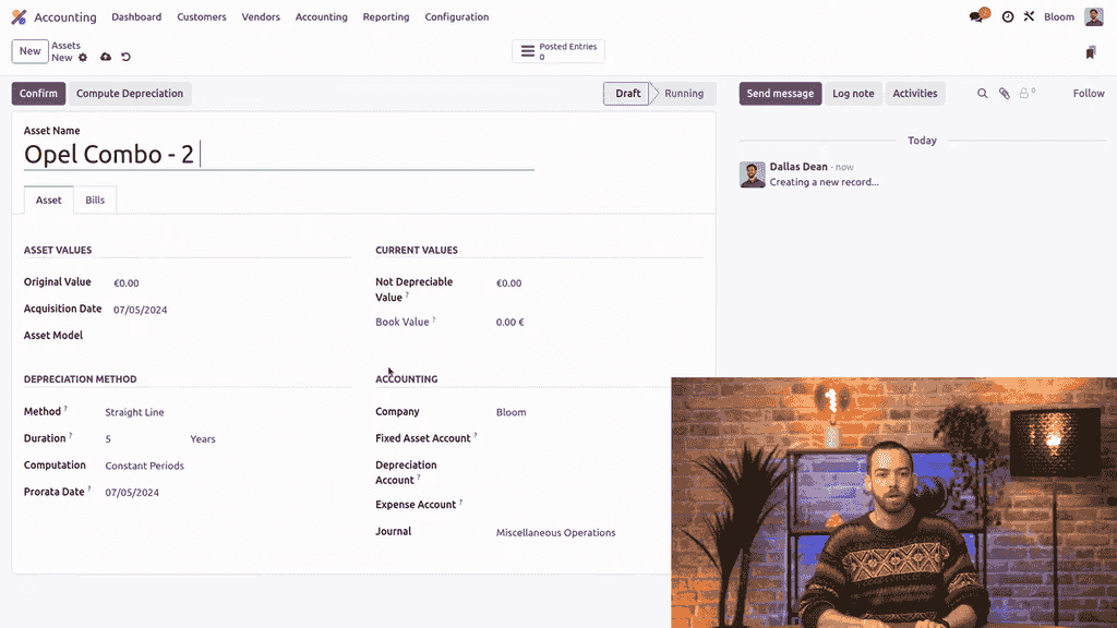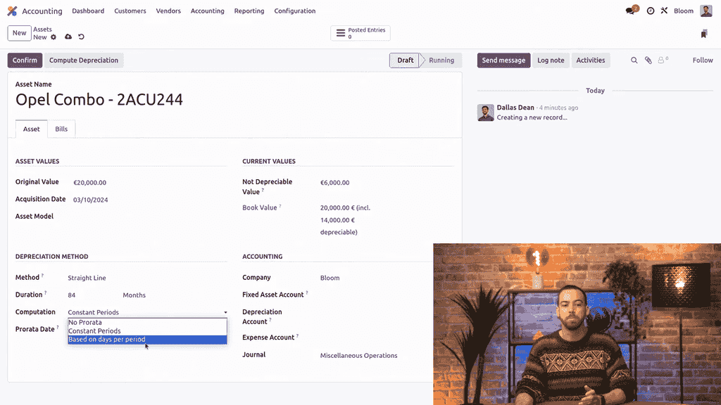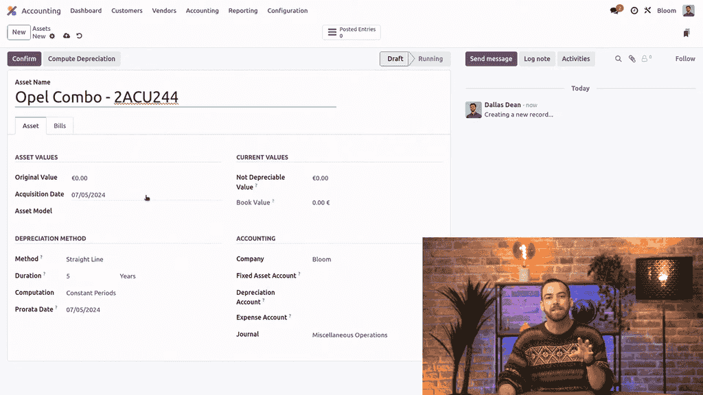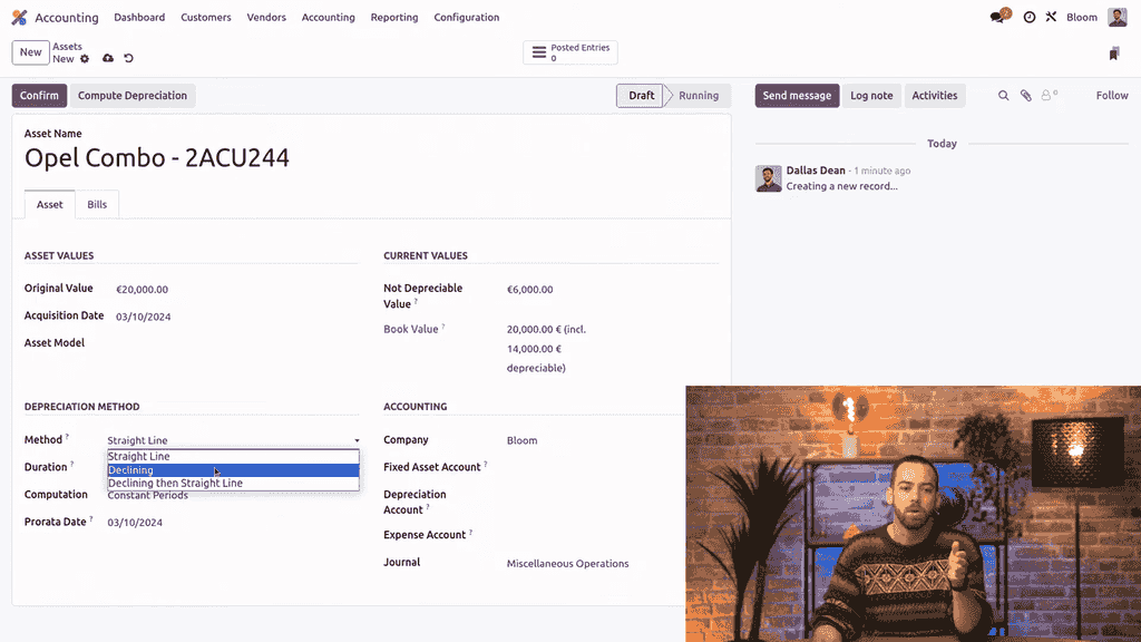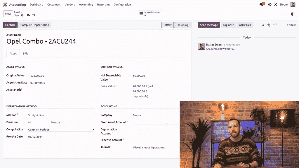 Odoo Accounting automates this process. You define the asset once, and Odoo generates all the depreciation entries for you.
