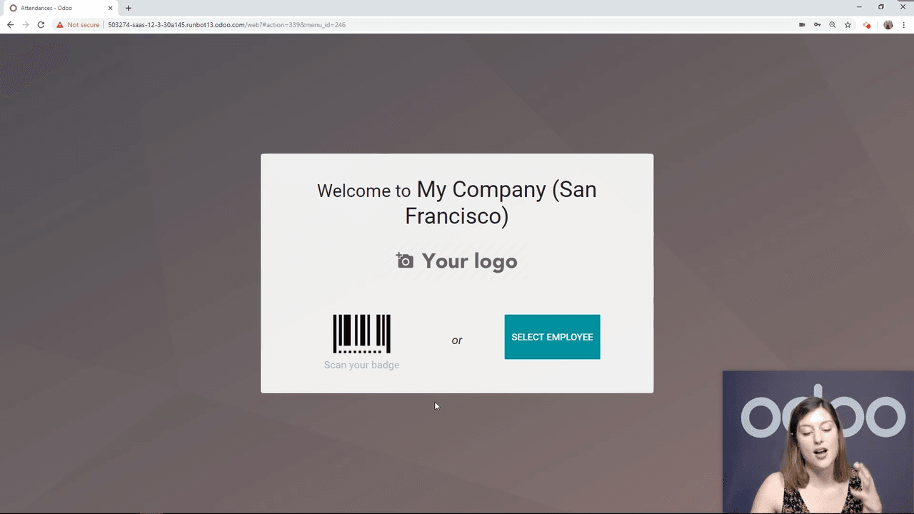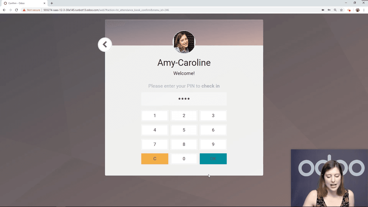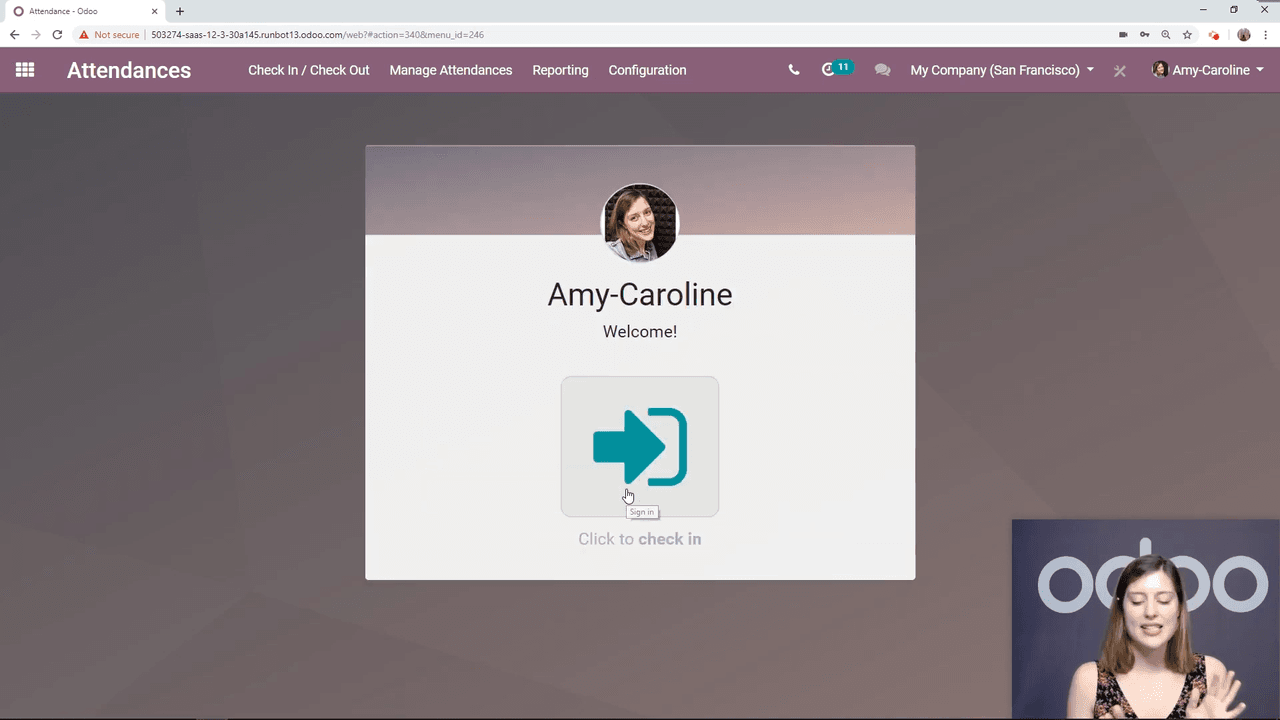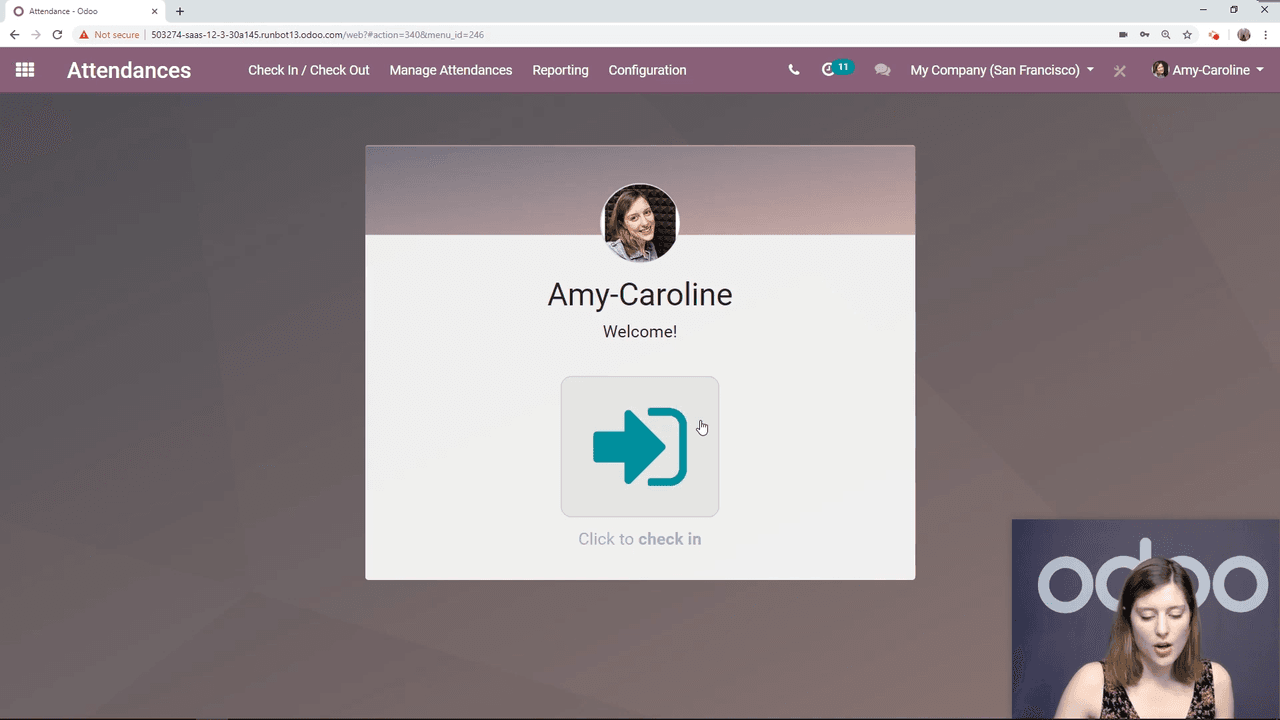 When you open the Attendance app, Odoo automatically recognizes the logged-in user. Checking in takes a single click: