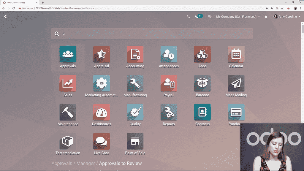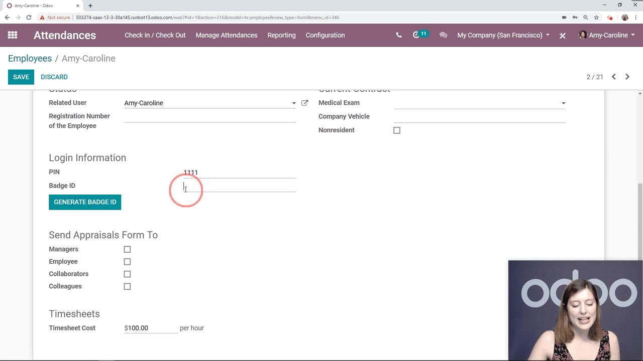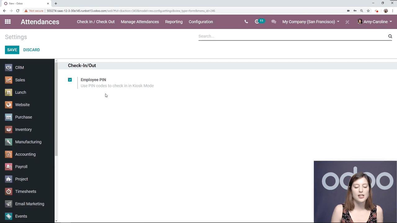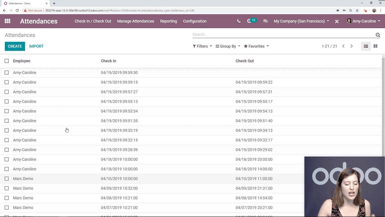 When you open the Attendance app, Odoo automatically recognizes the logged-in user. Checking in takes a single click: