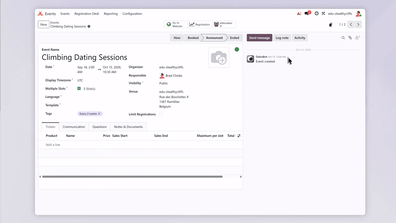 Long-term growth for a climbing gym depends on building a strong community. Odoo's Website and Events apps help establish an online presence and organize community activities.