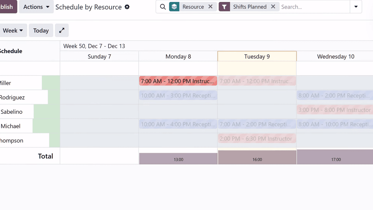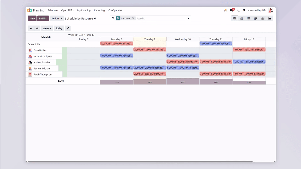 Climbing gyms typically operate from morning to late evening, making shift scheduling a time-consuming administrative task. The Odoo Planning app simplifies the entire process.
