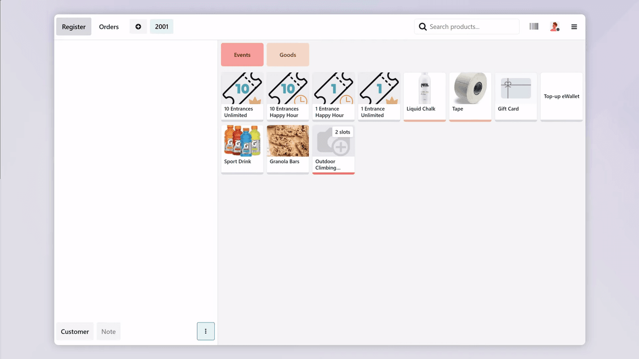 From climbing shoes and chalk to snacks and drinks, inventory status is always visible at a glance.