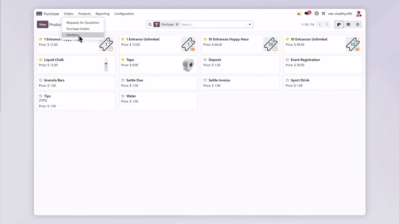 Running out of chalk or energy bars directly impacts the customer experience. The Odoo Purchase app works with the Inventory module to keep retail products and operational supplies in stock.
