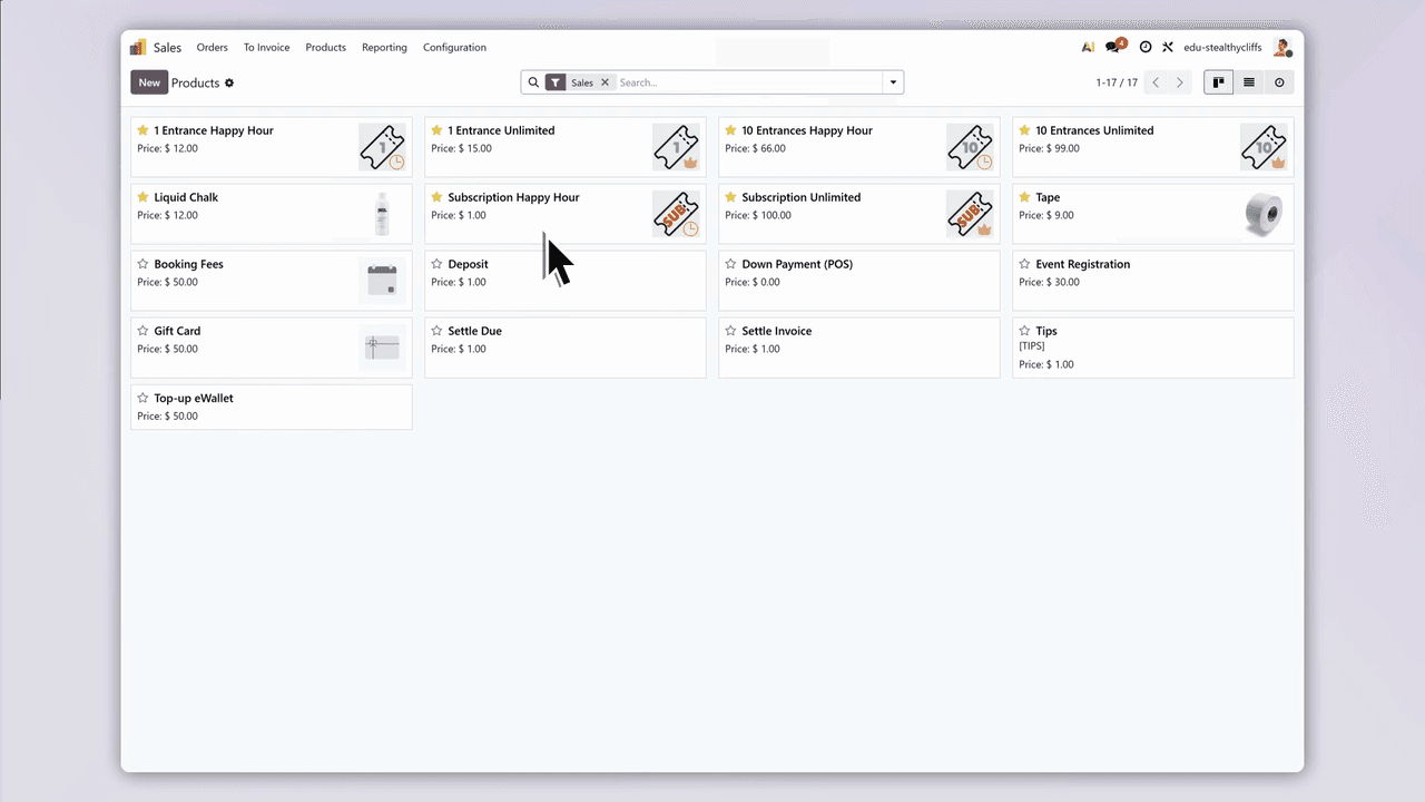 A climbing gym's revenue typically comes from day passes, punch passes, and monthly memberships. Odoo provides two apps to handle these different sales types.