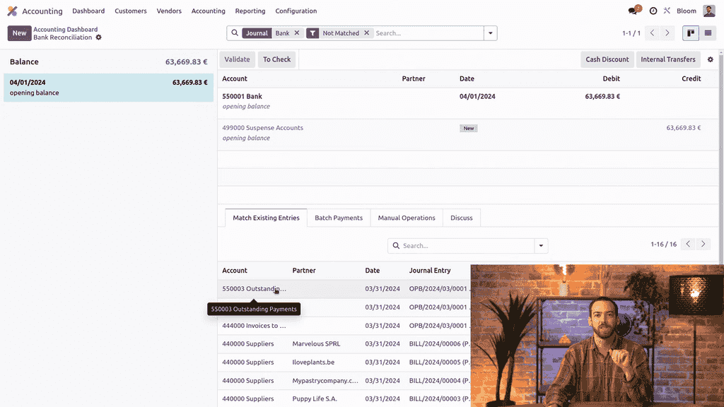 - 點擊 Reconcile — Odoo 會建議匹配的期初分錄