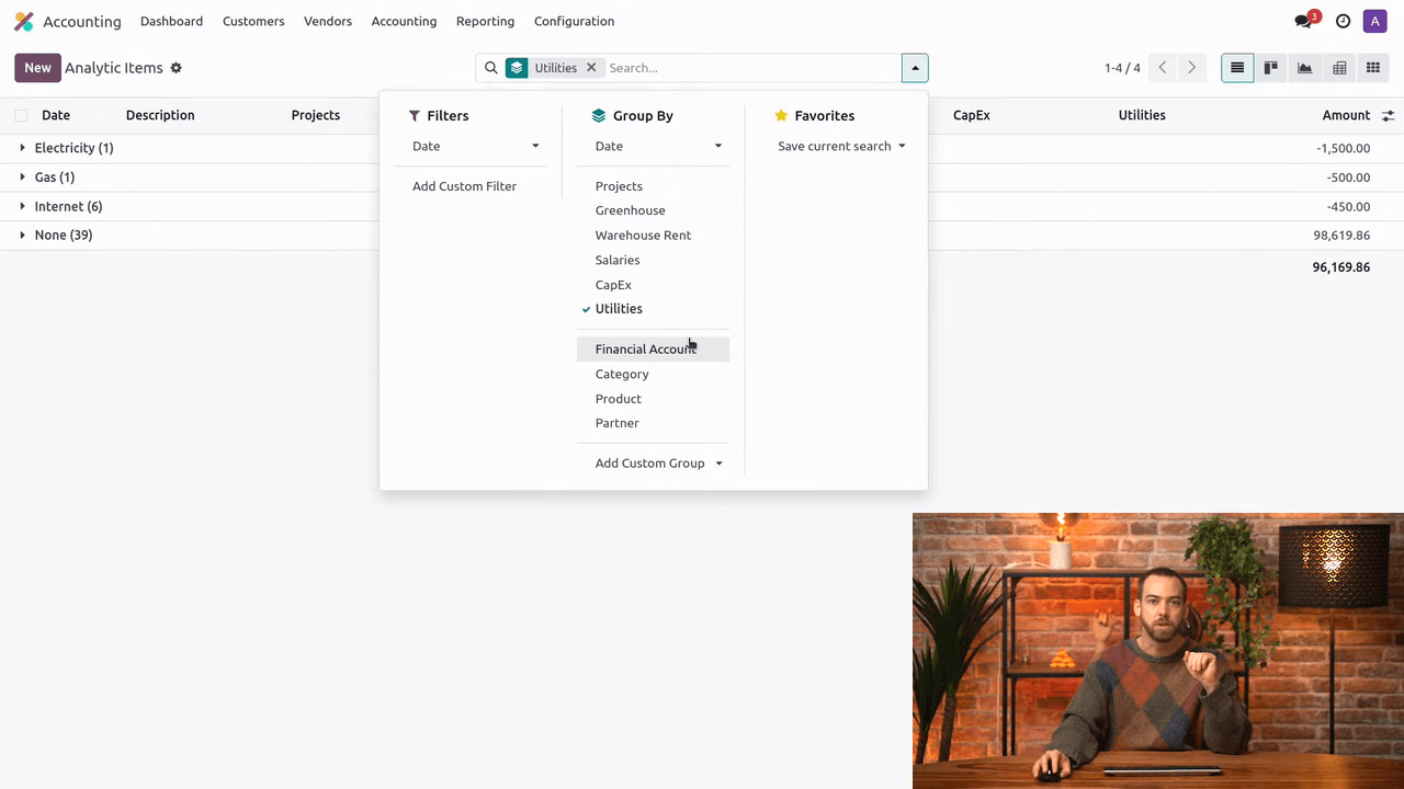 此視圖可幫助你監控支出模式,並將實際成本與預算進行比較。如需更深入的財務規劃,可將分析會計與 Odoo 的預算管理功能結合使用。