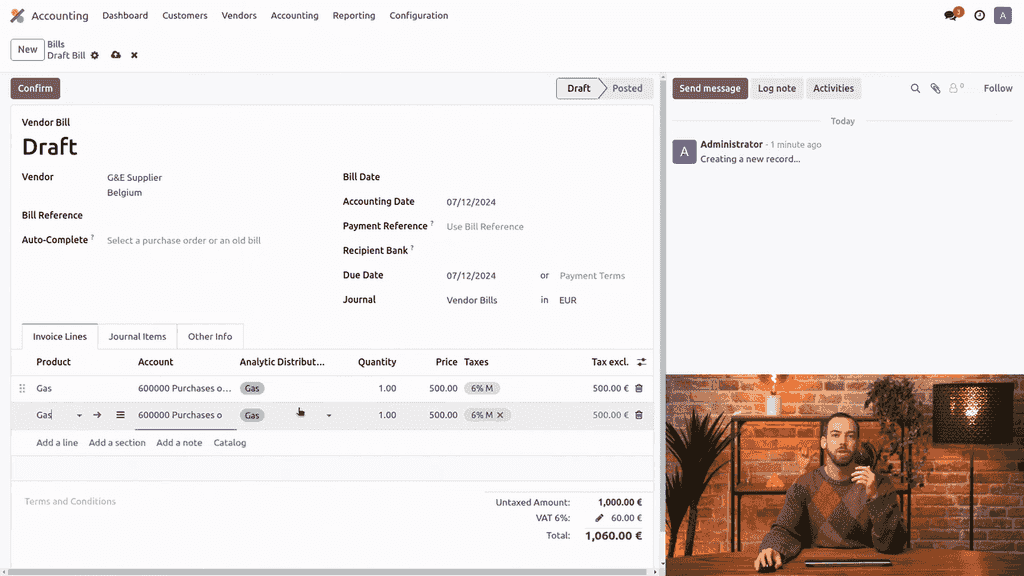 - 前往 Accounting > Vendors > Bills 並點擊 New