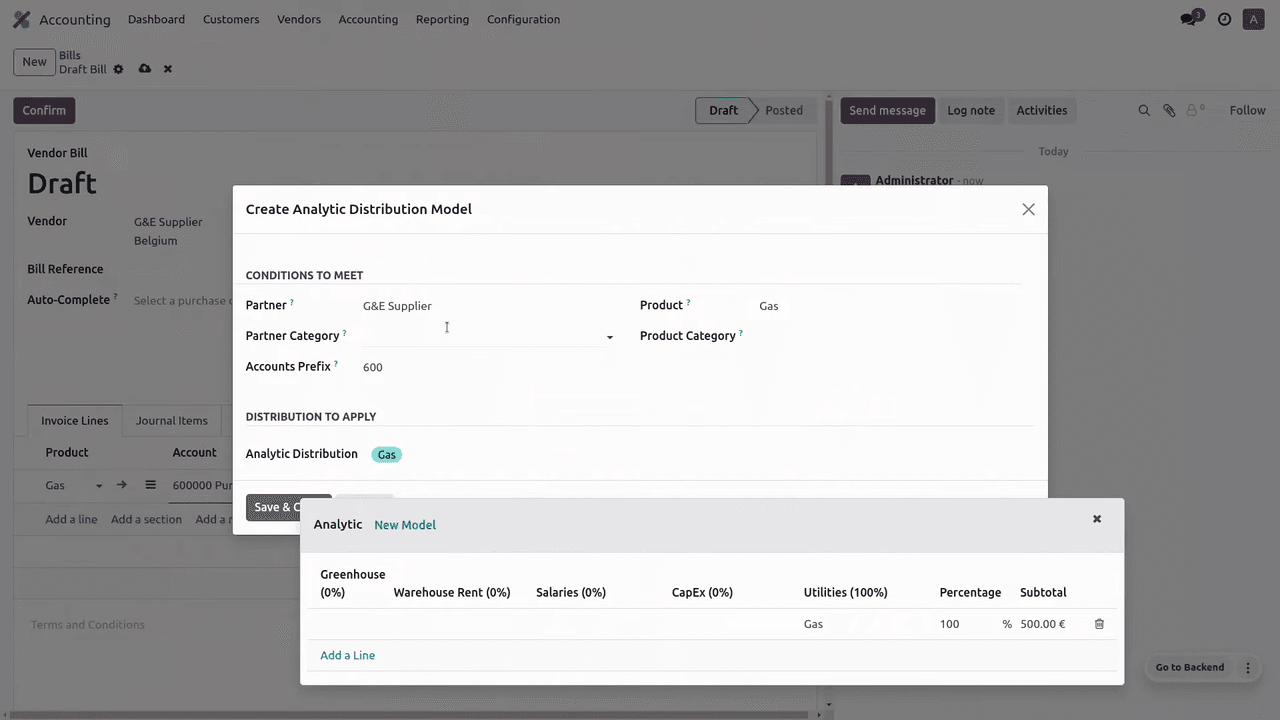下次建立符合這些條件的明細行時,Odoo 會自動填入分析分配。