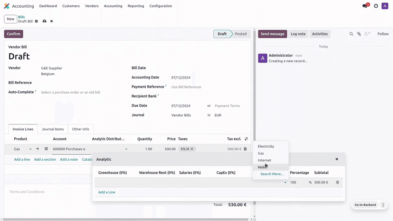 - 在 Analytic Distribution 欄位中,選擇計劃和帳戶