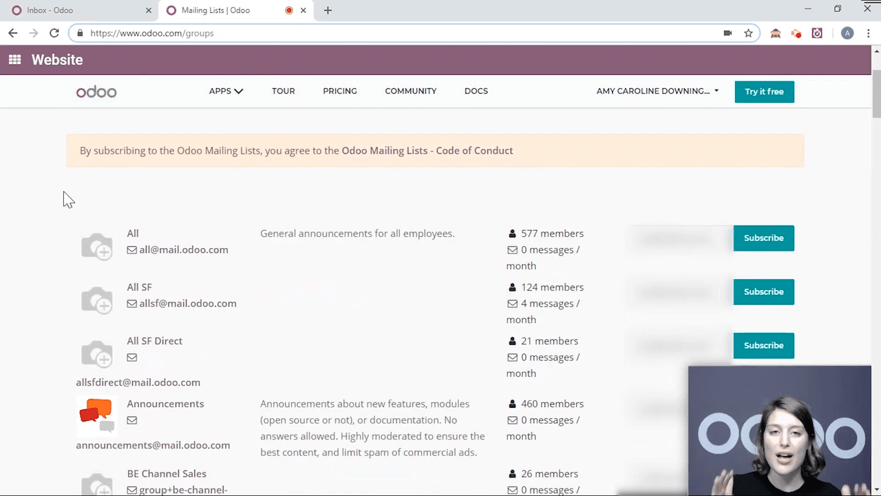 如果你安裝了網站模組,你可以建立一個頁面,讓入口網站使用者(客戶、供應商)自行訂閱或取消訂閱公開頻道。這是一個自助功能,可以減少行政負擔。