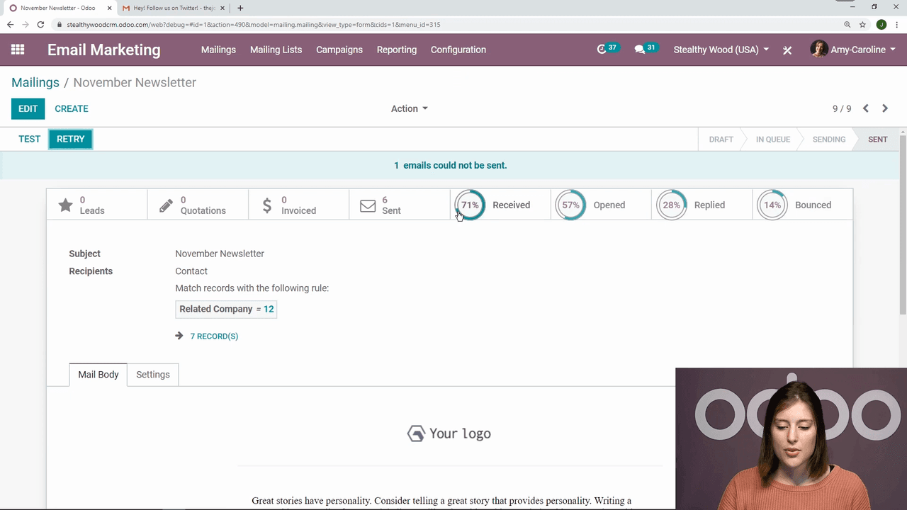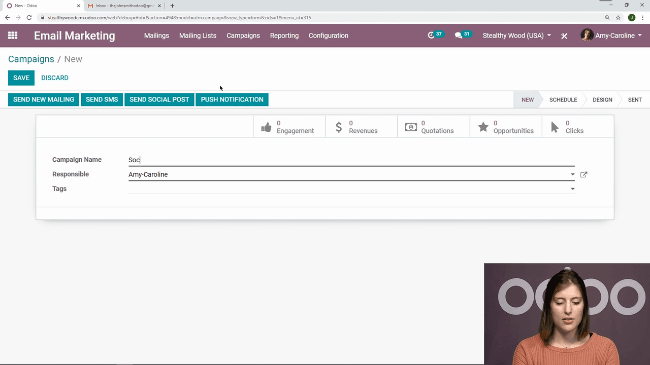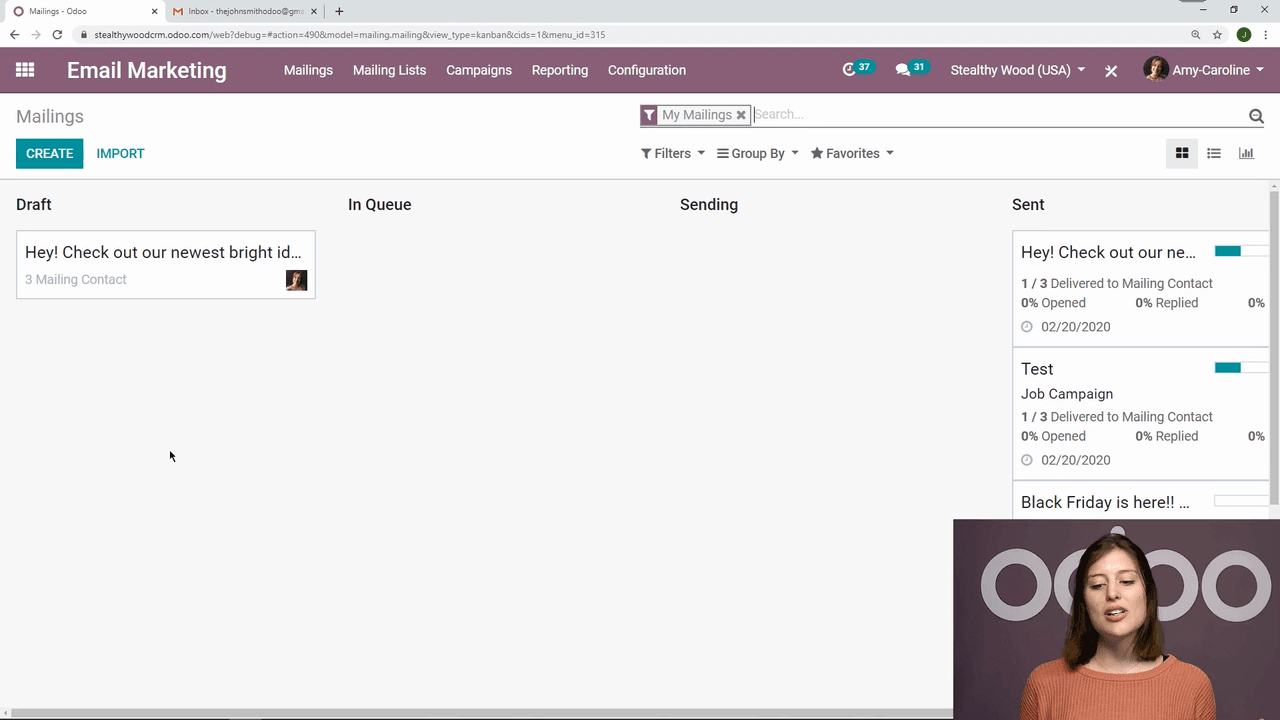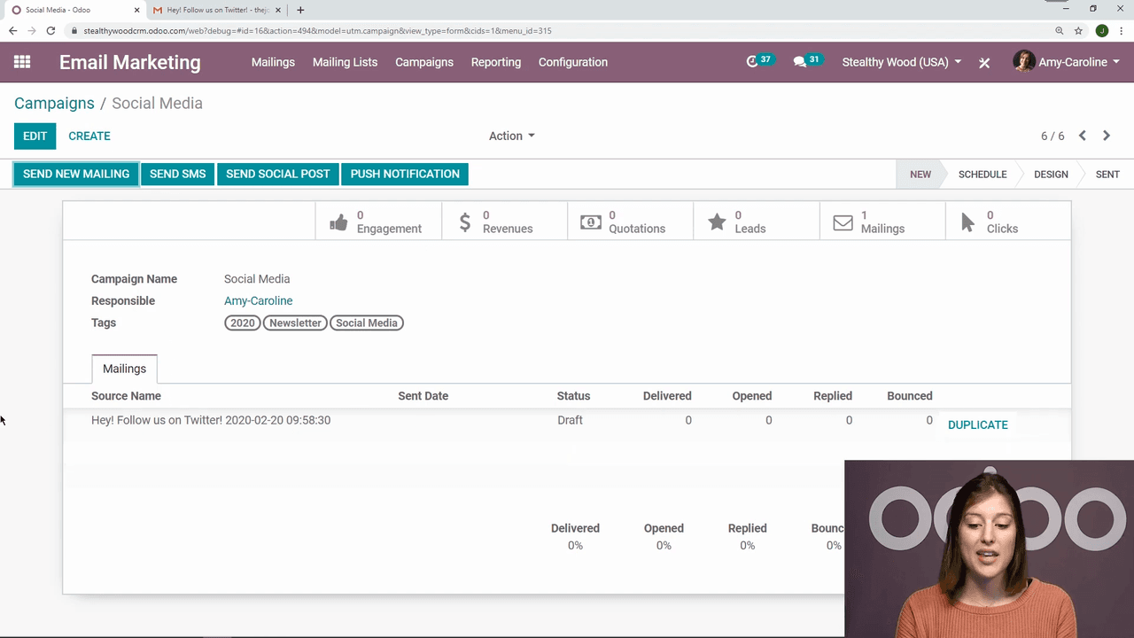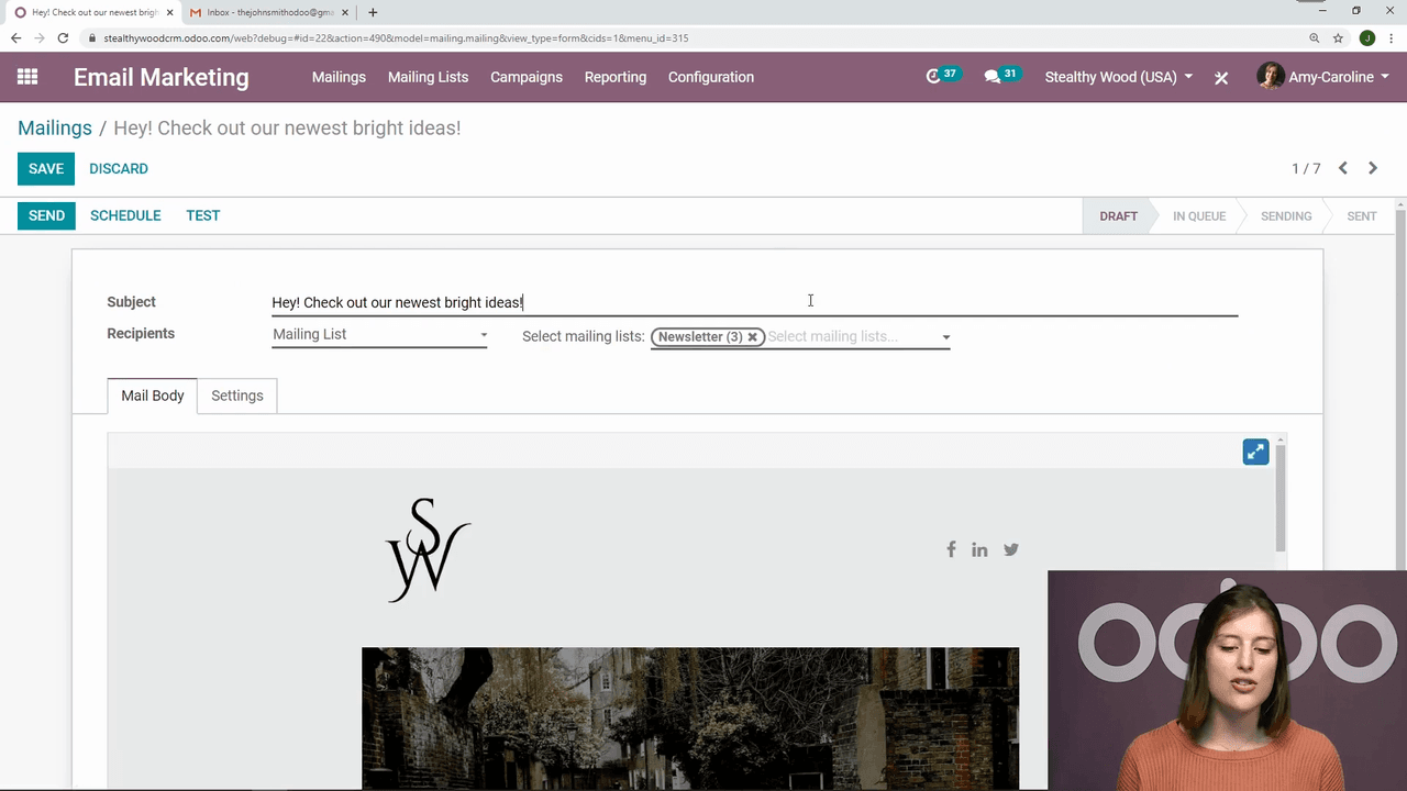 Odoo 的電郵行銷模組提供你所需的一切功能,讓你在同一個介面中建立、發送、排程及分析電郵推廣活動。
