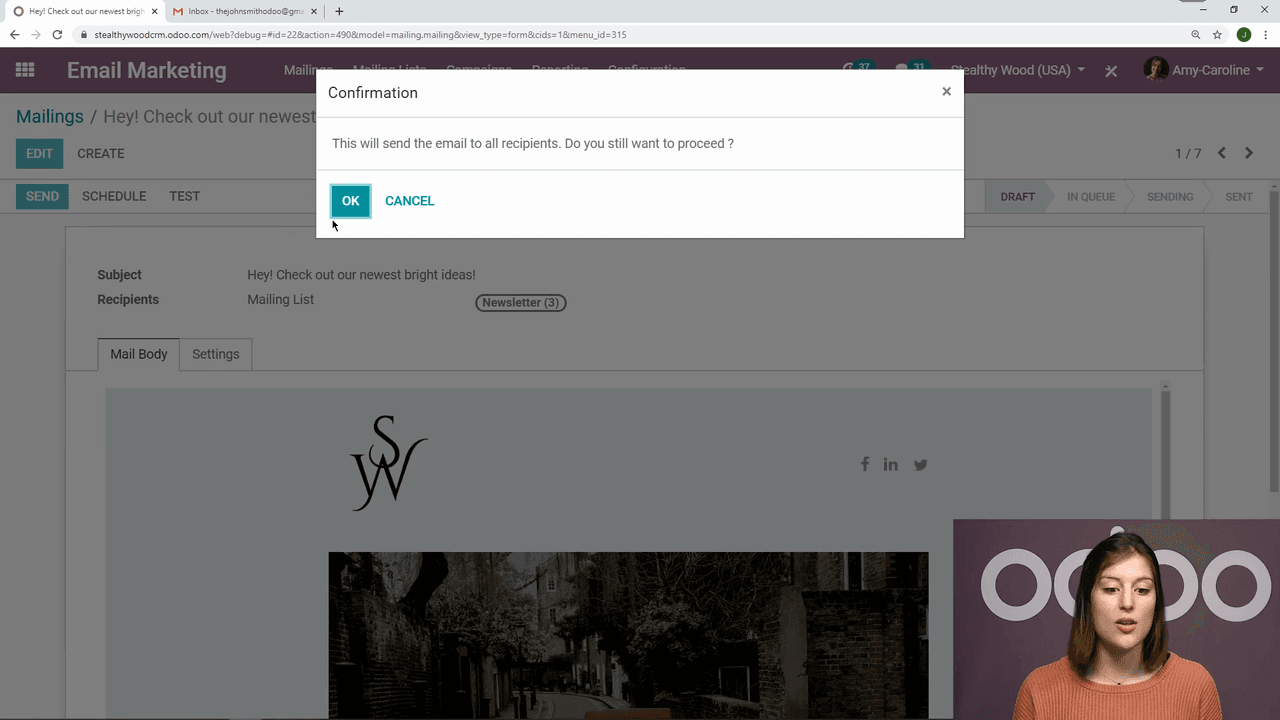 點擊發送後,Odoo 會要求確認,以防止誤發。電郵狀態會從草稿變為排隊中。在排隊期間,如果發現錯誤仍可取消——電郵會退回草稿狀態以供編輯。