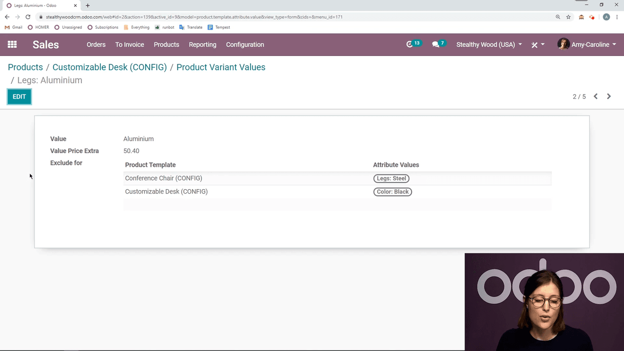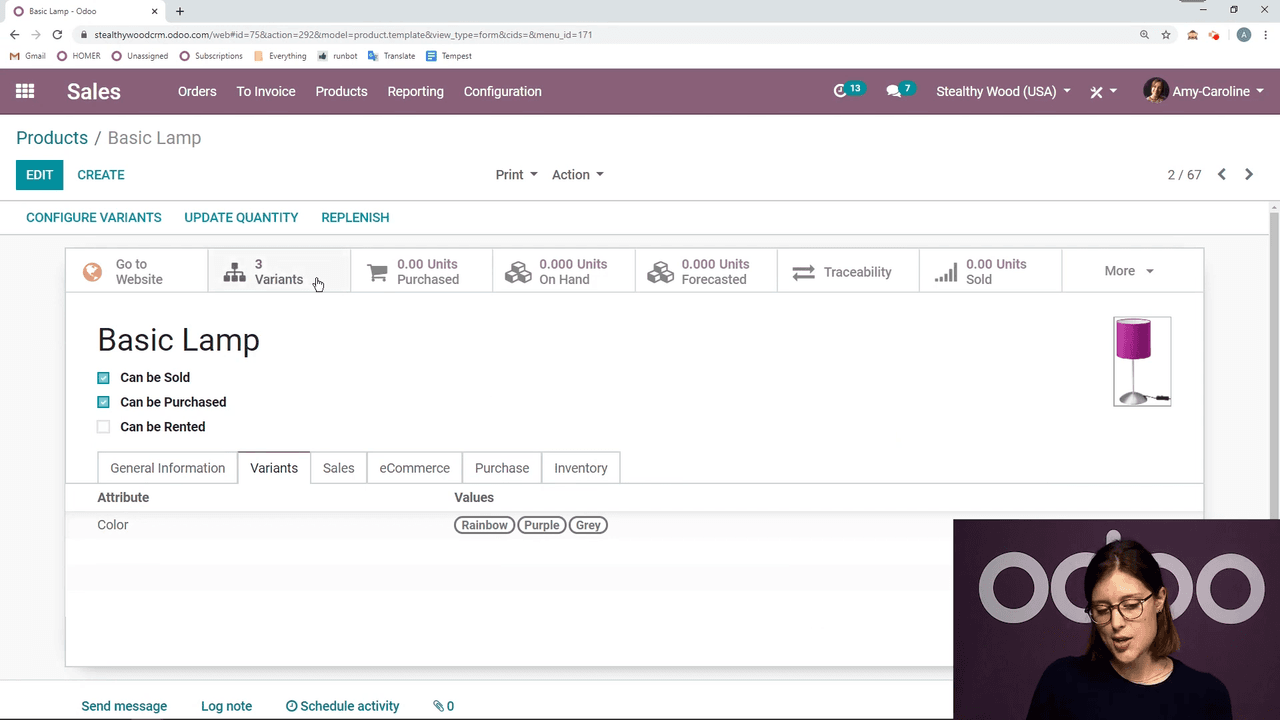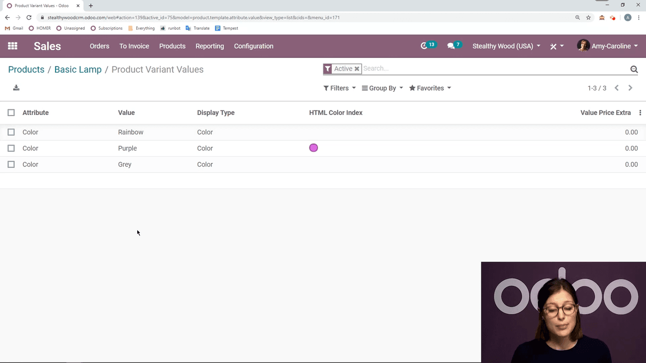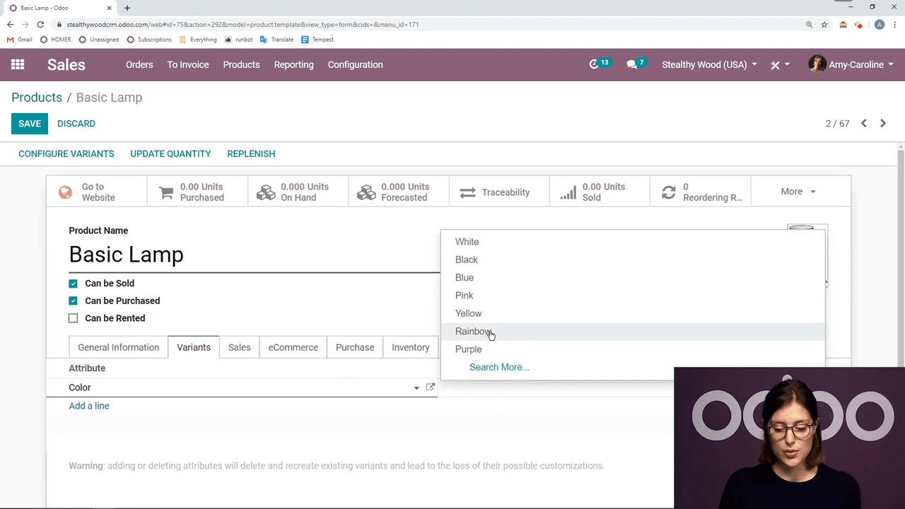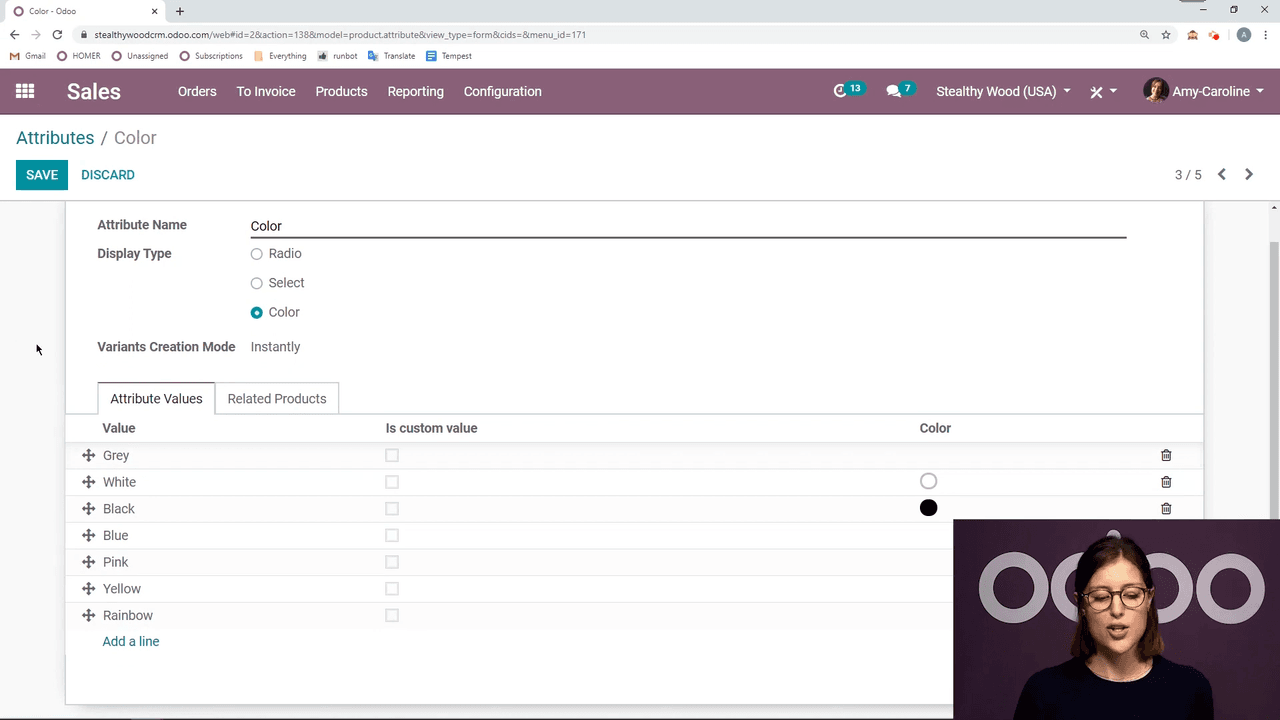 Odoo 會根據你的選擇生成變體。如果變體建立模式設為即時,變體會立即出現。你隨時可以新增更多值——例如為現有產品引入新的顏色選項。