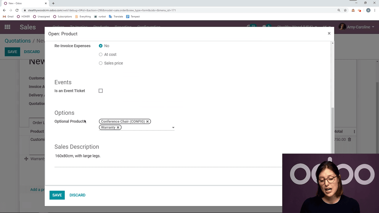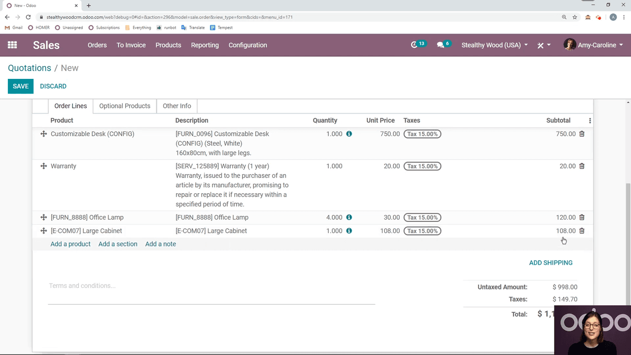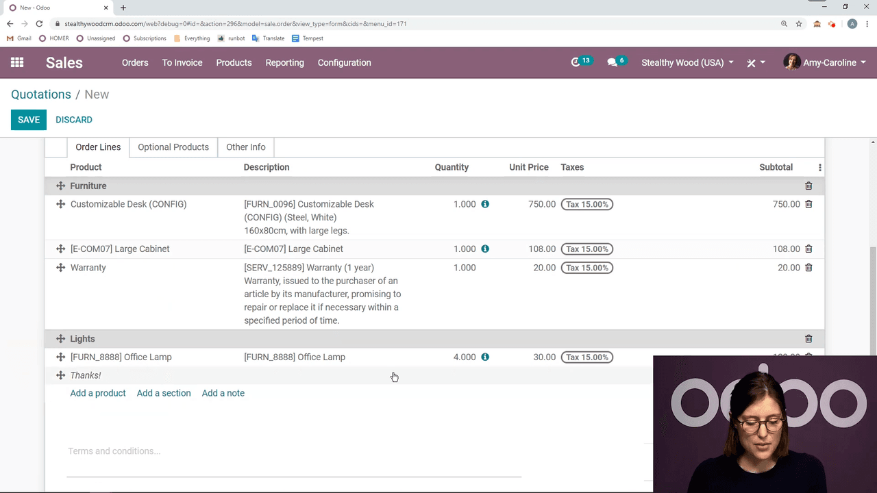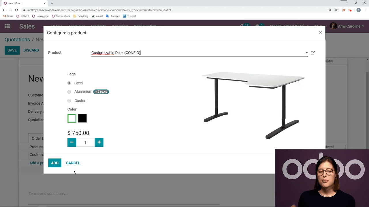 在訂單明細中點擊 新增產品 開始建立報價內容。當你選擇具有變體的產品時,Odoo 的 產品配置器 會自動彈出,讓你選擇客戶所需的確切規格。