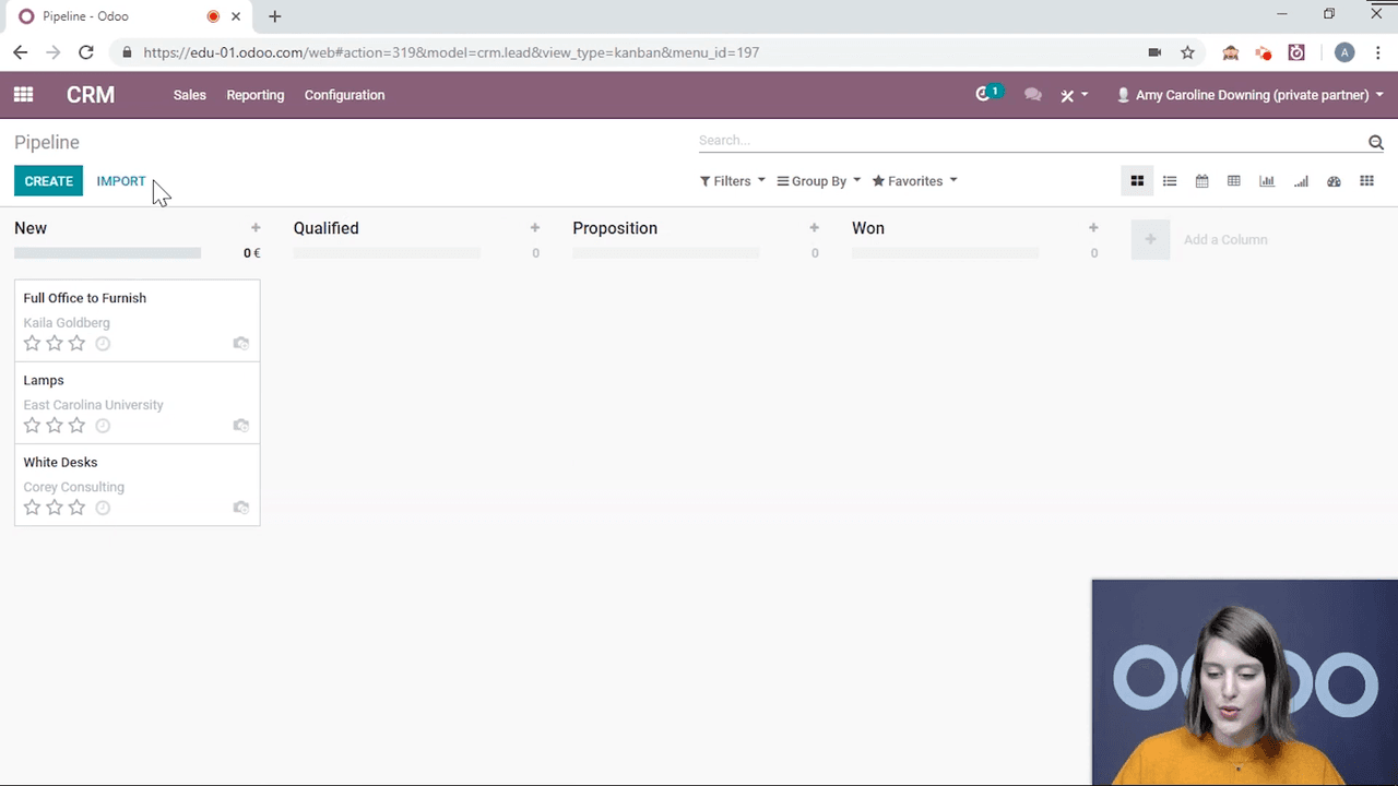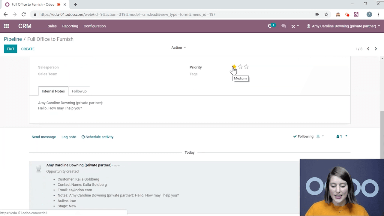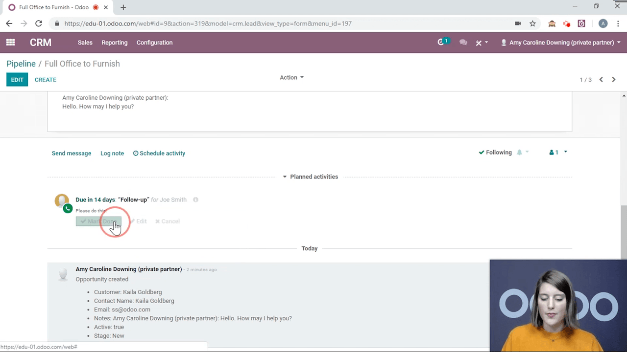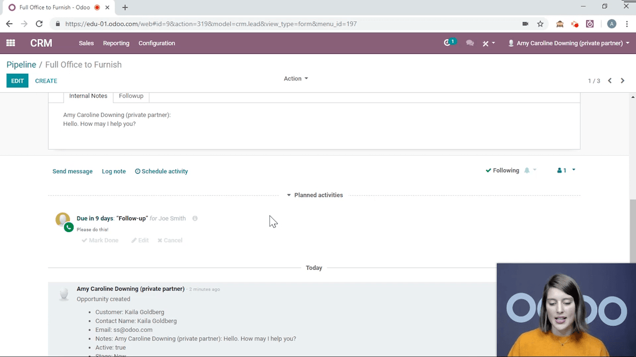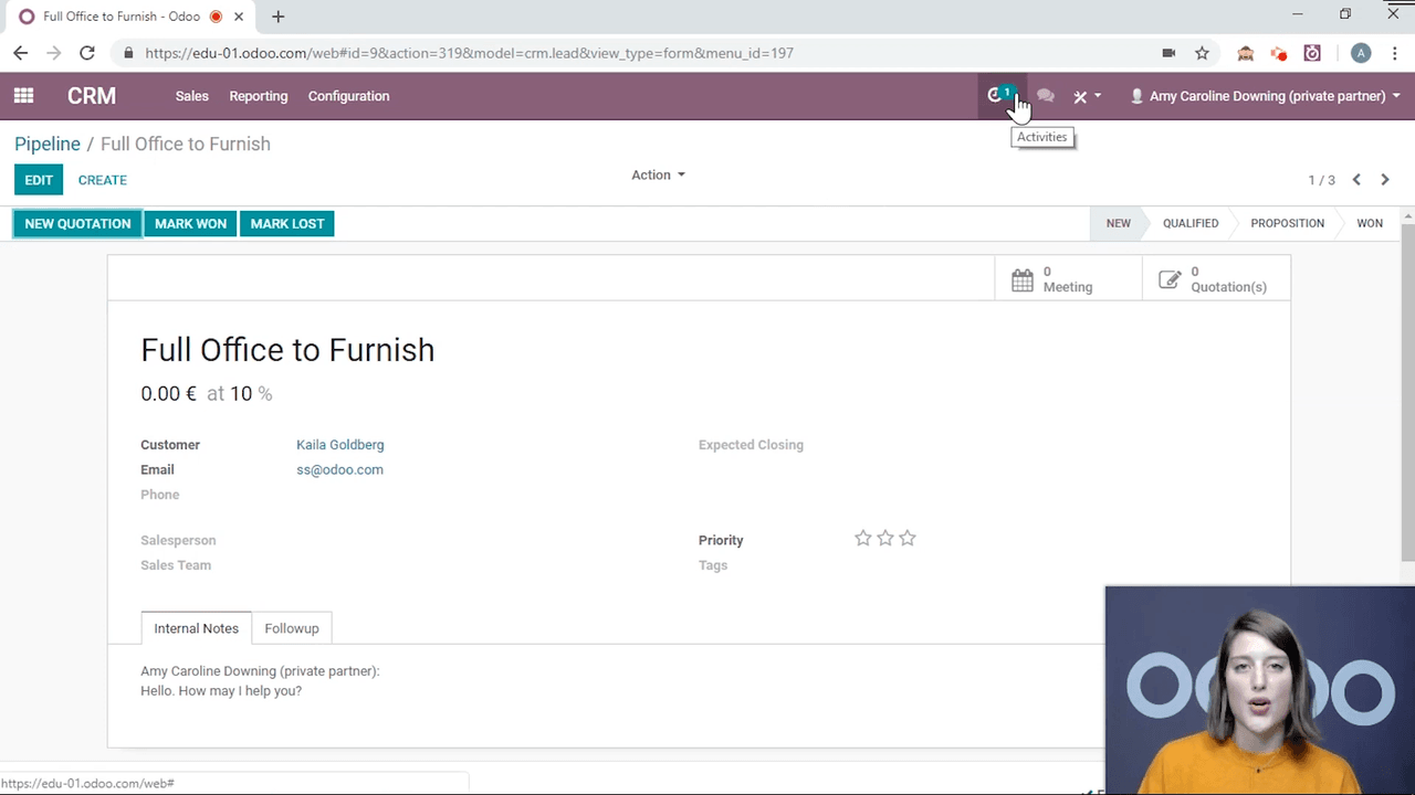 前往任何模組——CRM、銷售、專案或其他模組。開啟你想要附加活動的記錄。例如,在 CRM 銷售管道中開啟一個潛在客戶。