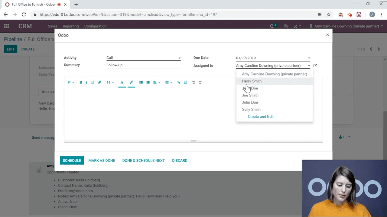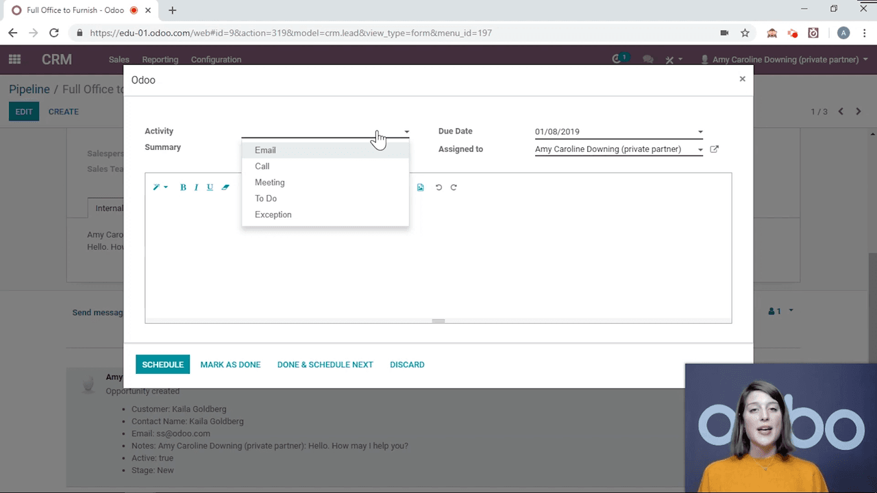 Odoo 的活動功能正好解決了這個問題——它將可執行的任務直接附加在記錄上,無論是潛在客戶、銷售訂單、專案任務,還是任何帶有討論串的文件。每項活動都包含類型、截止日期、負責人,以及可選的備註,確保萬無一失。